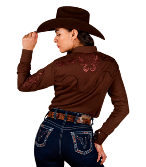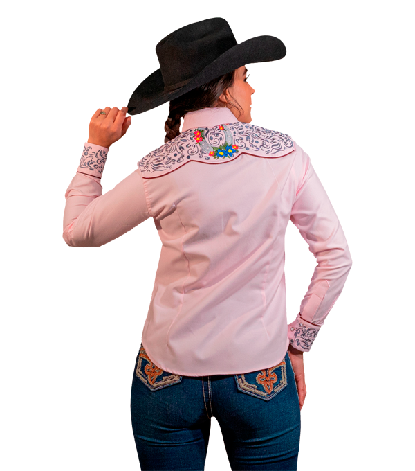 BLUSA VAQUERA DE DAMA ROSA TELA OXFORD CON BORDADO HERRADURA